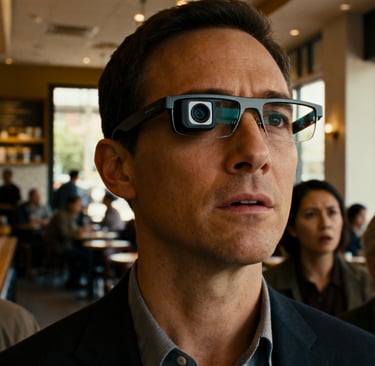 Você está sentado em uma cafeteria, conversando com amigos, aproveitando um momento de descontração. Ao seu redor, pessoas normais fazem coisas normais: leem livros, digitam em laptops, tomam café. Mas há algo que você não percebe — uma pessoa usando óculos aparentemente comuns está gravando tudo ao seu redor.